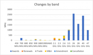 Although most of the changes to the database arose from awards, assignments for 932.8 MHz of spectrum were down to other factors, predominantly in bands below 2.6 GHz.