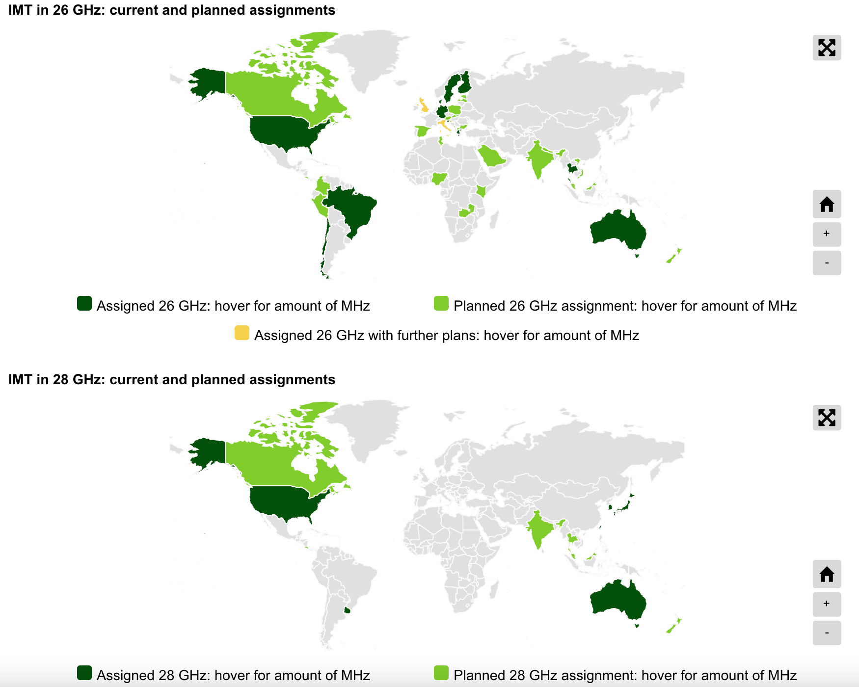 But as we reveal in our 26 GHz and 28 GHz band benchmark, the two bands are not mutually exclusive. In fact, as the map below shows, many countries have awarded both bands.