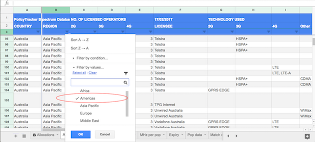 This will bring up entries for all 800 MHz spectrum licenses in the Americas. You can use as many autofilter selections as necessary, allowing you to drill down to find the data you need.